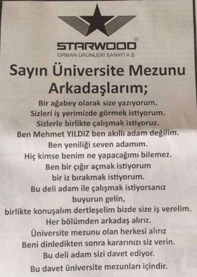"Sayın üniversite mezunu arkadaşlarım. Bir ağabey olarak size yazıyorum. Sizleri iş yerimizde görmek istiyorum. Sizlerle birlikte çalışmak istiyoruz. Ben Mehmet Yıldız, ben akıllı adam değilim. Ben yeniliği seven adamım. Hiç kimse benim ne yapacağımı bilemez. Ben bir çığır açmak istiyorum, bir iz bırakmak istiyorum. Bu deli adam ile çalışmak istiyorsanız buyurun gelin, birlikte konuşalım, dertleşelim, biz de size iş verelim. Her bölümden arkadaş alırız. Üniversite mezunu olan herkesi alırız. Beni dinledikten sonra kararınızı siz verin. Bu deli adam sizi davet ediyor. Bu davet üniversite mezunları içindir."
