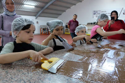 Sergilenen eserler için yaklaşık 8 ton çikolata kullanılan Bursa Çikolata Müzesi’ndeki atölye çalışmasına katılan çocuklar, ünlü çikolata şefi Mesut Kırımlı’dan çikolata yapmayı öğrendi.