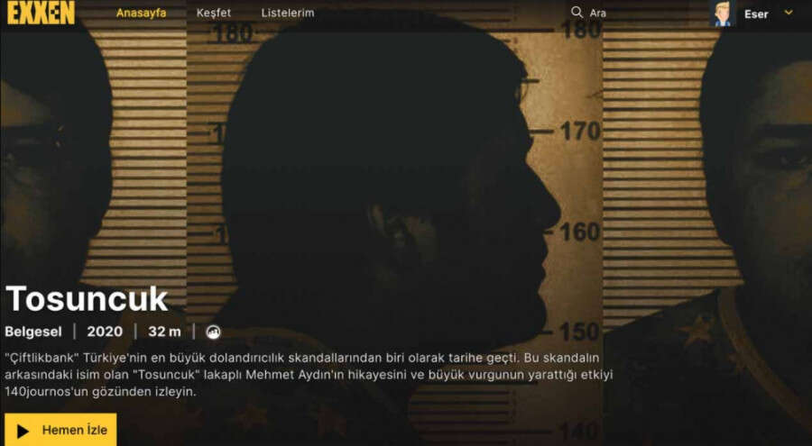 Exxen'in özel belgesellerinden bir tanesi, "Tosuncuk" oldu. 140journos isimli grup tarafından hazırlanan belgesel, Türkiye'nin en büyük dolandırıcılık olayı Çiftlik Bank'ın bir numaralı ismi Mehmet Aydın'ın hikayesini anlatıyor.