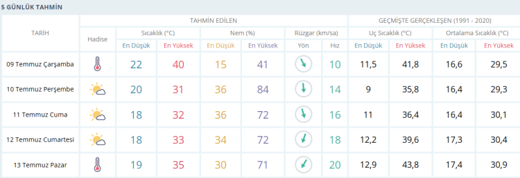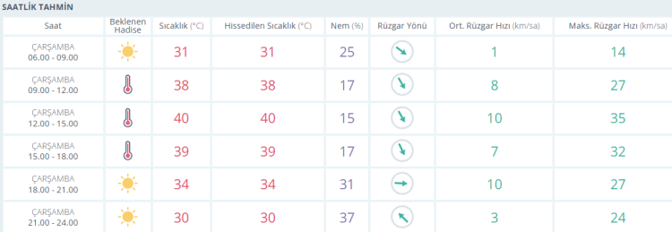 Sabah saatlerinde 22 derece civarında ölçülen hava sıcaklığının, öğle saatlerinde 40 dereceye kadar çıkması öngörülüyor. Akşam saatlerinde 34 dereceye, gece saatlerinde ise 30 dereceye kadar düşeceği tahmin ediliyor.