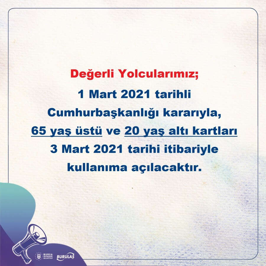 Değerli Yolcularımız; 1 Mart 2021 tarihli Cumhurbaşkanlığı kararıyla, 65 yaş üstü ve 20 yaş altı kartları 3 Mart 2021 tarihi itibariyle kullanıma açılacaktır.