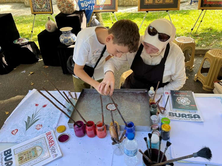 Ayrıca çini sanatını yakından inceleyip, yapım aşamalarında kullanılan malzemeler hakkında bilgi edindiler. Türk İslam sanatlarından ebru sanatının da tanıtıldığı stant yoğun ilgi gördü. Özel koleksiyon olarak hazırlanan Türk Dünyası Kültür Başkenti Bursa temalı sergideki tezhip tablolar da ziyaretçilerden tam not aldı.