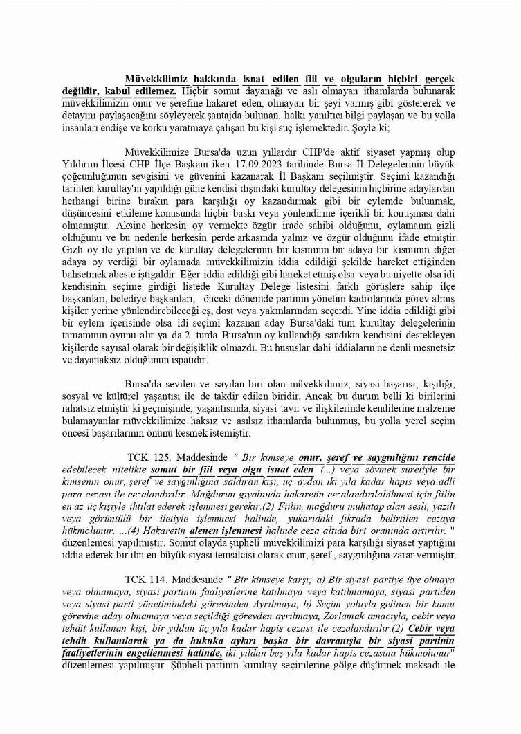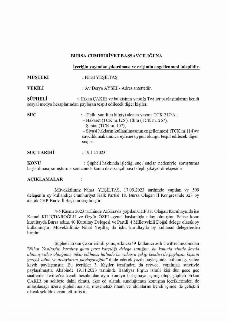 Cumhuriyet Halk Partisi Bursa İl Başkanı Nihat Yeşiltaş, sosyal medyada paylaşılan ve ulusal medyada çıkan iddialara iddialara yönelik açıklama yaptı. Yeşiltaş, "Gerekli suç duyurumu savcılığa yaptım" dedi.