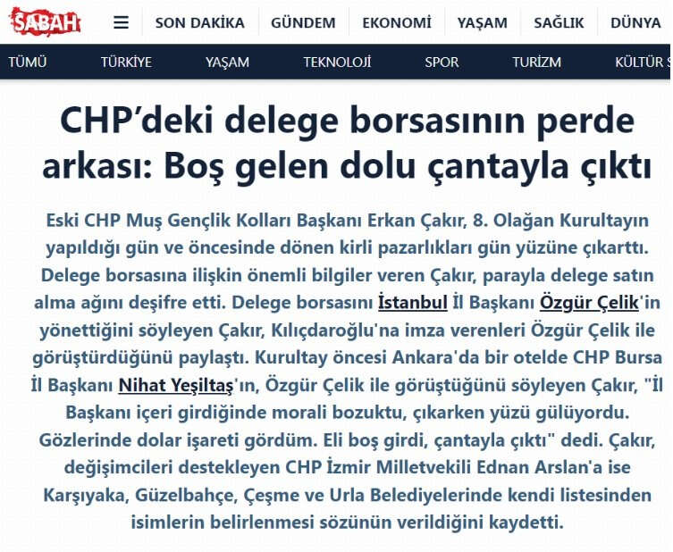 "Kurultay öncesinde Ankara'da bulunulan süre içerisinde elbette ki İl Başkanları ve parti büyükleriyle görüşmeler oldu. Bu en gerçek ve tabii olandır. Bu görüşmeler arasında sayın Özgür Çelik ile de görüştüm. Ortamda başkaları da vardı. Ancak para alındığına yönelik iddialar asla ve asla gerçeği yansıtmamaktadır.