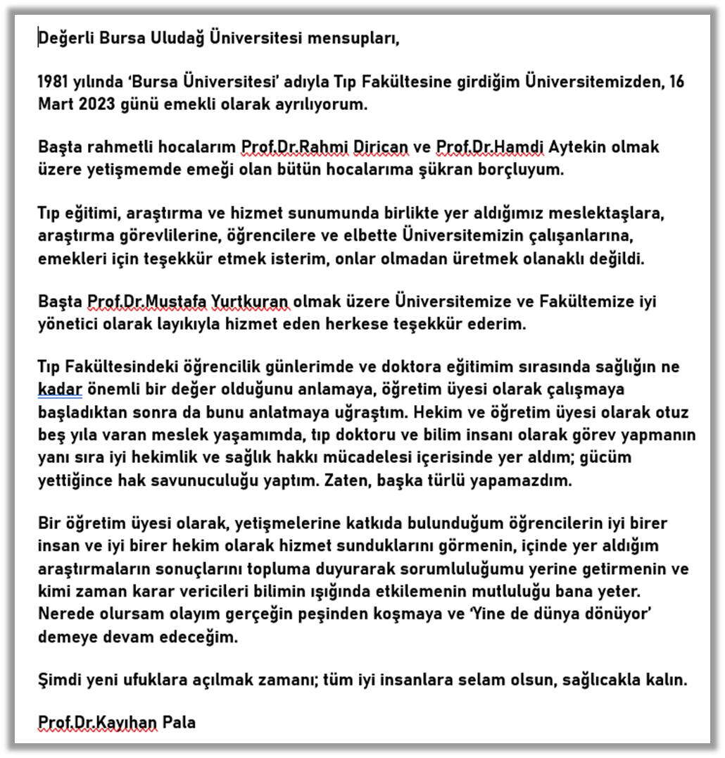 Pala, Uludağ Üniversitesi'nden ayrılışını şu sözlerle duyurdu.