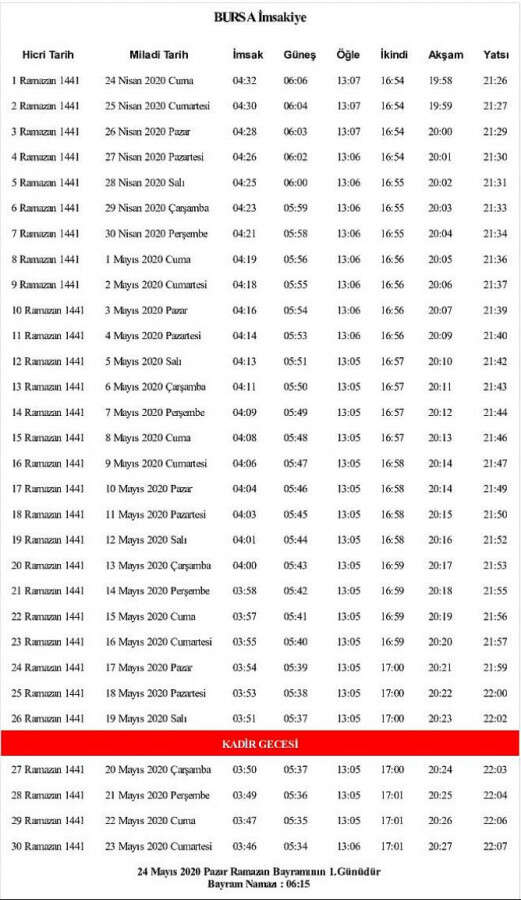 Buna göre Bursa'da iftar saatleri, sahur vakitleri şu şekilde;