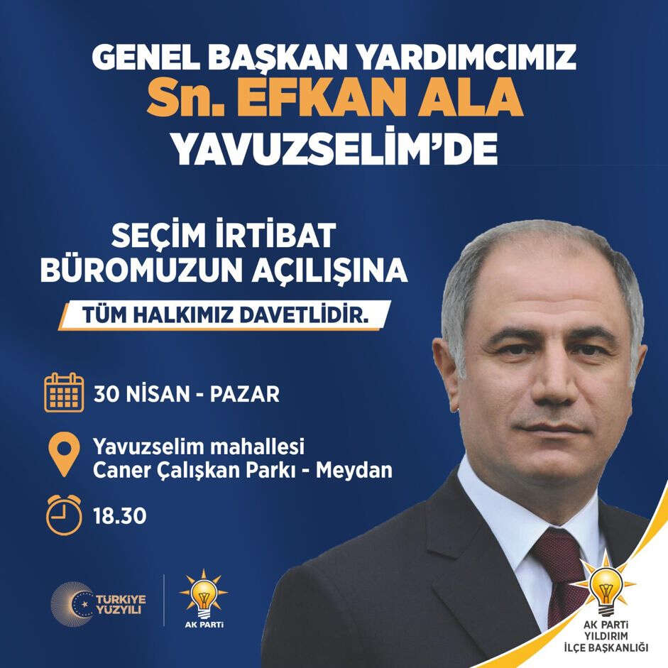AK Parti Genel Başkan Yardımcısı Efkan Ala, Bursa'nın Yıldırım ilçesinde bugün seçim irtibat bürosunun açılışını yapacak.