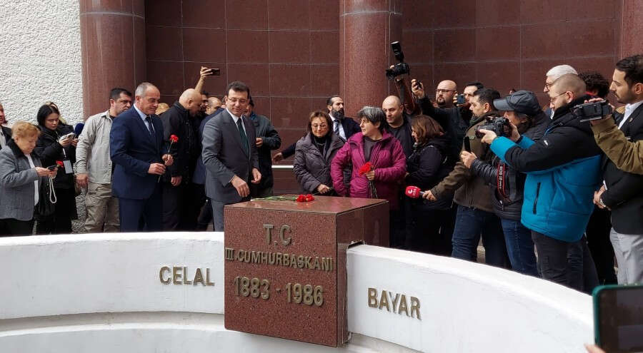 Esnaf ziyaretinin ardından Ekrem İmamoğlu, Türkiye'nin üçüncü cumhurbaşkanı Celal Bayar'ın kabrine ziyaret gerçekleştirdi.