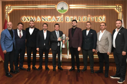 Bursaspor Başkanı Enes Çelik ve yönetim kurulu üyeleri şampiyonluk kupasıyla Osmangazi Belediye Başkanı Erkan Aydın’ı ziyaret etti.