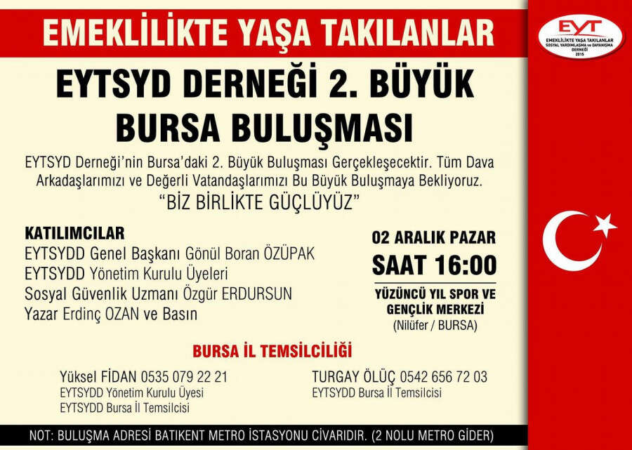 Emeklilikte Yaşa Takılanlar Sosyal Yardımlaşma ve Dayanışma Derneği (EYTSYDD), Bursa'da ikinci büyük buluşmayı düzenliyor. 'Biz birlikte güçlüyüz' sloganıyla yapılan toplantıların ilki adeta izdihama yol açmış, EYT'lileri toplantının düzenlendiği salon almamıştı.