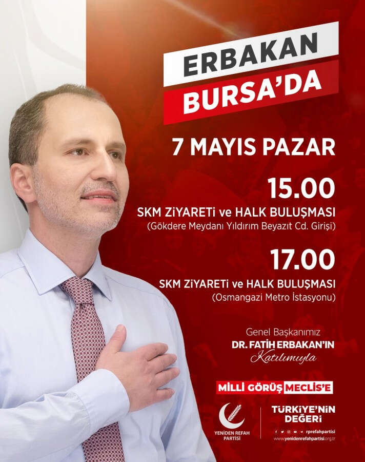 Yeniden Refah Partisi Genel Başkanı Fatih Erbakan, 7 Mayıs pazar günü Bursa'da seçmenle buluşacak.