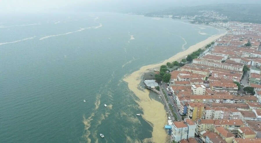 Bursa'nın Marmara Denizi'ne kıyısı olan Gemlik ilçesinde denizde biriken salya tabakasının havadan çekilen görüntüsü etki ettiği alanın büyüklüğünü gözler önüne serdi.