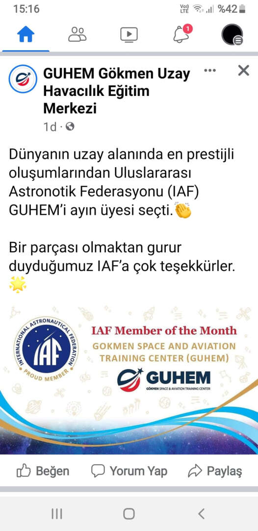 Dünyanın uzay alanında en prestijli oluşumlarından Uluslararası Astronotik Federasyonu (IAF) Gökmen Uzay Havacılık Eğitim Merkezi'ni (GUHEM) ayın üyesi seçti.