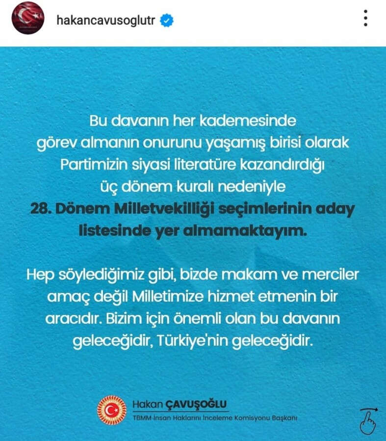 AK Parti Bursa Milletvekili Hakan Çavuşoğlu: "Partimizin siyasi literatüre kazandırdığı üç dönem kuralı nedeniyle 28. Dönem Milletvekilliği seçimlerinin aday listesinde yer almamaktayım."