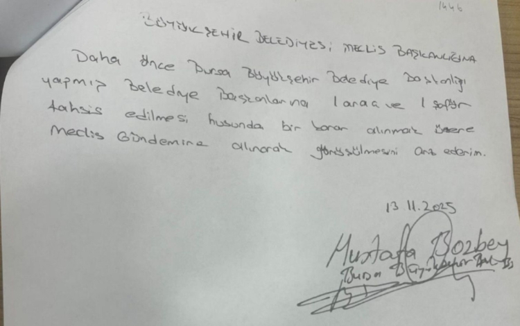 Bursa Büyükşehir Belediye Meclisi’nin Kasım ayı ikinci oturumuna getirilmek üzere Büyükşehir Belediye Başkanı Mustafa Bozbey’in 13.11.2025 tarihli yazılı önergesi ile “Bursa’da daha önce görev yapmış Büyükşehir Belediye Başkanlarına birer araç ve birer şoför tahsis edilmesinin meclis gündemine alınmasını” istedi. Ancak Plan Bütçe Komisyonu bu absürt talebi oy birliğiyle reddetti. Bursa gündemine bomba gibi düşen ve ulusal basının da büyük ilgi gösterdiği önerge daha meclis gündemine gelmeden reddedildi.