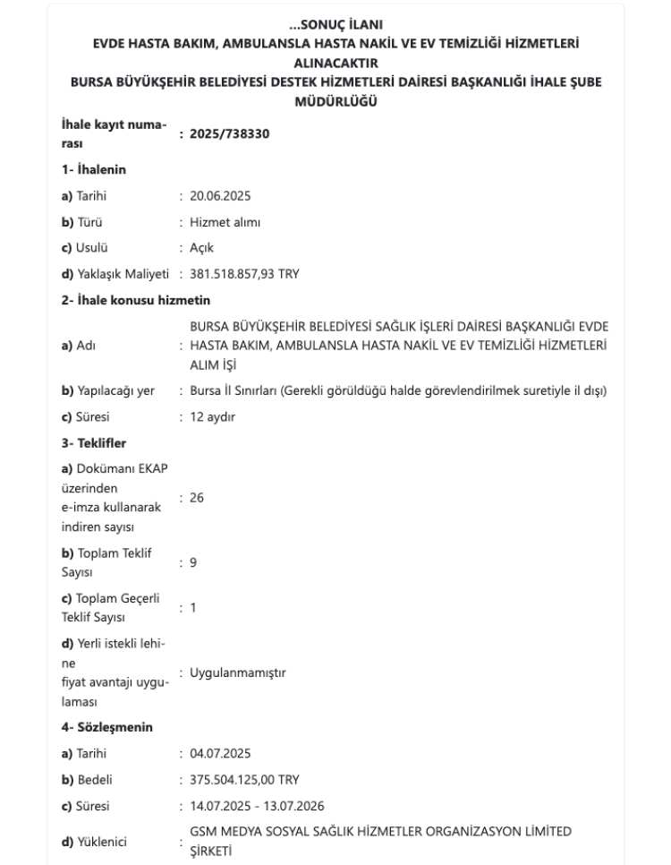 İşte soruşturma kapsamında ortaklarından biri tutuklanan diğeri ise firari olan GSM Medya Sosyal Sağlık Hizmetler Organizasyon şirketinin 20 Haziran 2025 tarihinde Bursa Büyükşehir Belediyesi Sağlık İşleri Daire Başkanlığı tarafından düzenlenen, “Hasta bakım, ambulansla hasta nakil ve ev temizliği hizmetleri” ihalesini aldığı ortaya çıktı. Firmaya 12 ay süreli hizmetler için 375 milyon 504 bin 125 lira ödeme yapılacağı ortaya çıktı. Son dönemde Bursa Büyükşehir Belediyesi ile ilgili birçok iddia gündeme gelirken, soruşturma kapsamındaki bir şirkete ihalenin verilmesi, İBB soruşturmasının Bursa’ya da yansıyabileceği görüşünün ağırlık kazanmasını beraberinde getirdi. Büyükşehir Belediyesi’nin konuyla ilgili bir iptal ya da açıklaması olmadı.