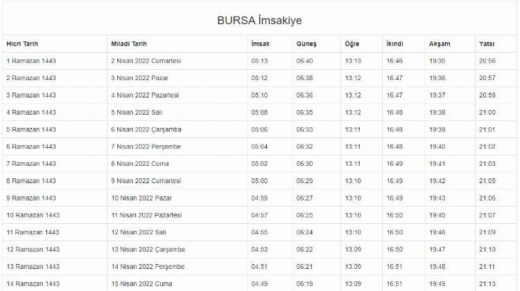 Diyanet İşleri tarafından yayımlanan Ramazan imsakiyesi ile birlikte Bursa için sahur ve iftar vakitleri netlik kazandı.