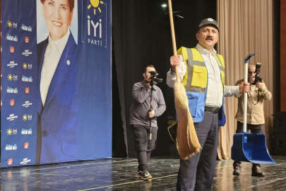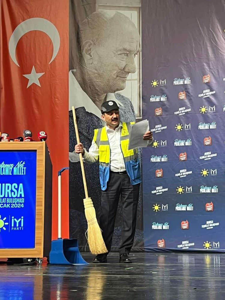 Selçuk Türkoğlu konuşmasını yapmak üzere sahneye Bursa Büyükşehir Belediyesi’nin işçilerine ait üniformayı üzerine giyerek eline süpürge ve kürek alarak çıktı.