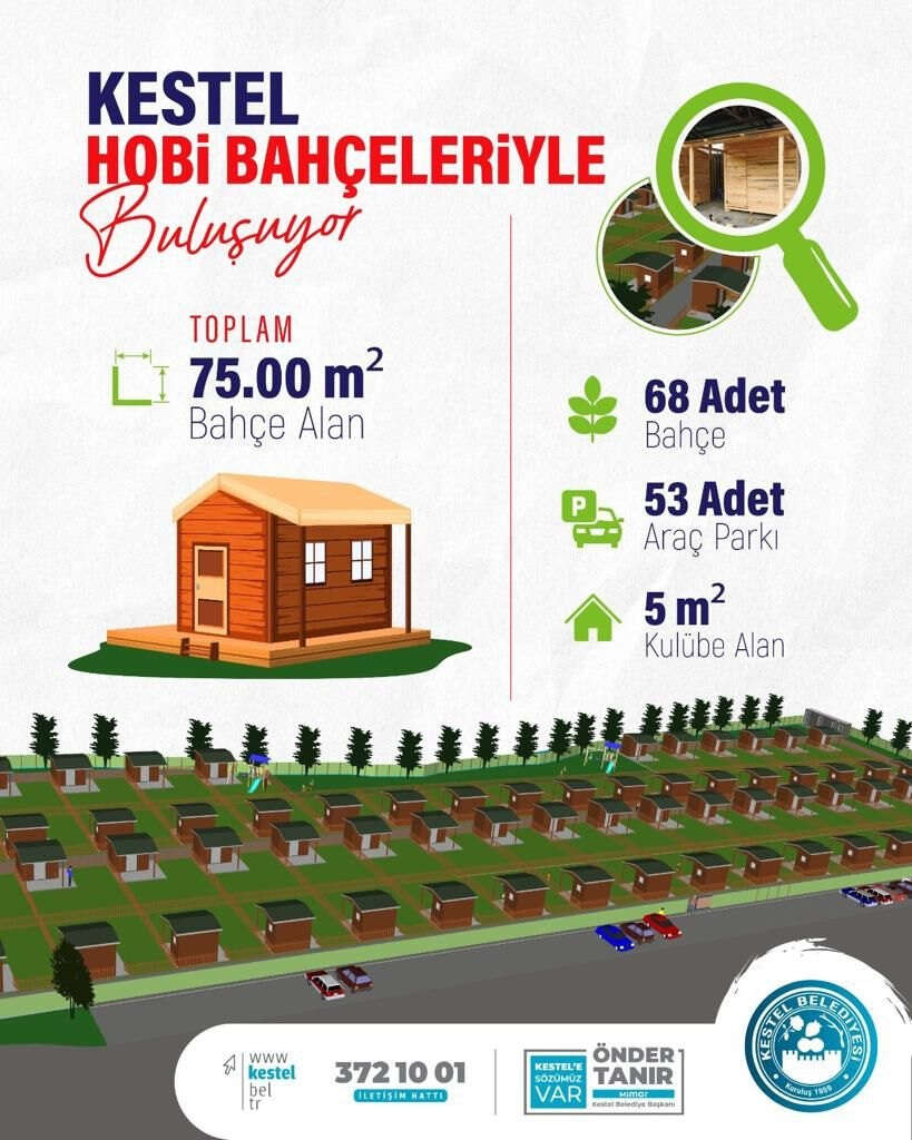 Kestel Beleidyesi tarafından Kozluören Mahallesi’nde 8 bin metrekare alan üzerine kurulacak olan hobi bahçesinin çalışmalarında sona gelindi. 75 metrekare tarım alanı, 5 metrekare ahşap kulübesi bulunan 68 hobi bahçesi, önümüzdeki günlerde alınacak olan müracaatların ardından noter huzurunda yapılacak olan kura çekimiyle kiracılara sunulacak.