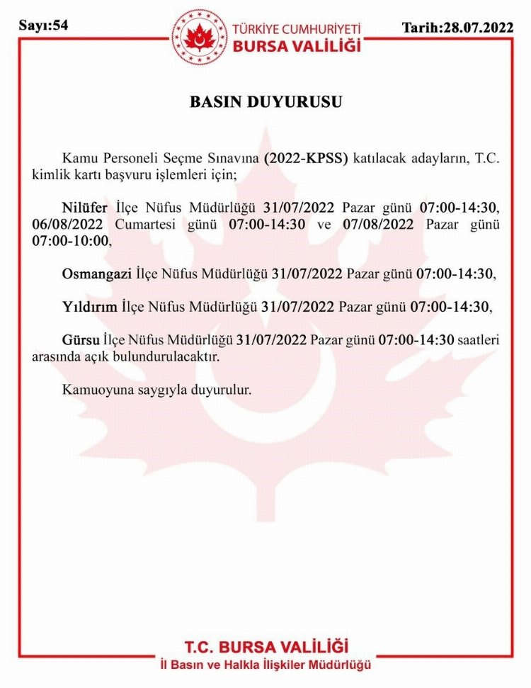 Osmangazi İlçe Nüfus Müdürlüğü 31/07/2022 Pazar günü 07:00-14:30,