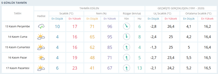BURSA İÇİN 5 GÜNLÜK HAVA DURUMU TAHMİNİ (13 KASIM 2025)