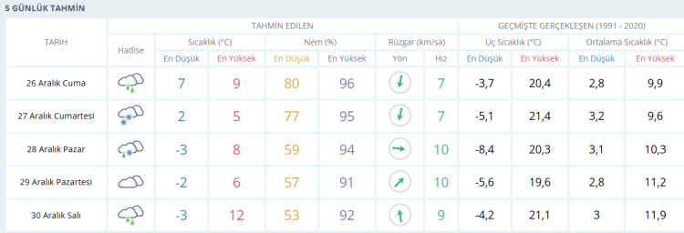 Meteoroloji Genel Müdürlüğü’nün tahminlerine göre, önümüzdeki 5 gün boyunca Bursa’da hava sıcaklıkları mevsim normallerinde seyredecek ve ortalama 7 derece civarında olacak.