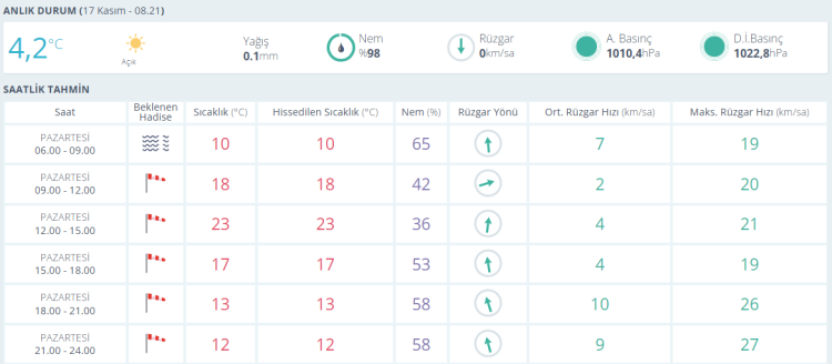 BURSA İÇİN SAATLİK HAVA DURUMU TAHMİNİ (17 KASIM 2025)