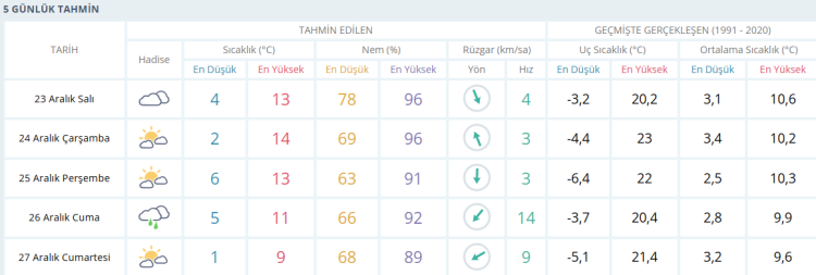 Önümüzdeki 5 gün boyunca hava sıcaklıklarının ortalama 12 derece civarında seyretmesi öngörülüyor.