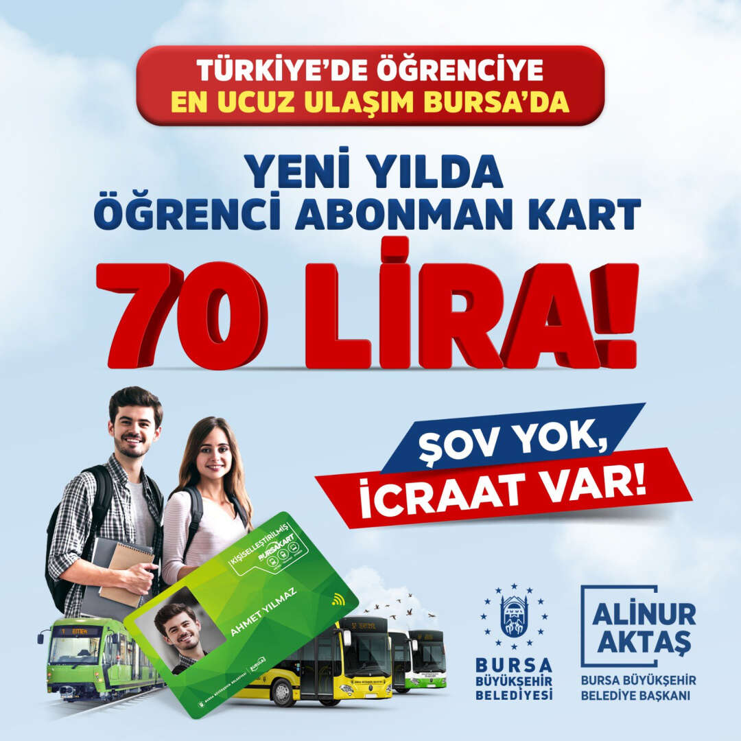 Abonman kartları ile aylık 160 biniş hakkı bulunan öğrencilerin ulaşım ücreti yaklaşık 44 kuruşa denk gelirken, bu fiyatla Türkiye genelinde öğrencileri en ucuz fiyatla taşıyan belediye, Bursa Büyükşehir Belediyesi oldu.