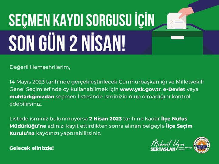 Bursa'nın Gemlik İlçesi Belediye Başkanı Uğur Sertaslan, vatandaşları seçmen kayıtlarını kontrol etmeleri için uyardı.
