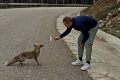 Uludağ'da yola inen tilkiyi gören vatandaş, sevimli hayvanı elleriyle besledi.