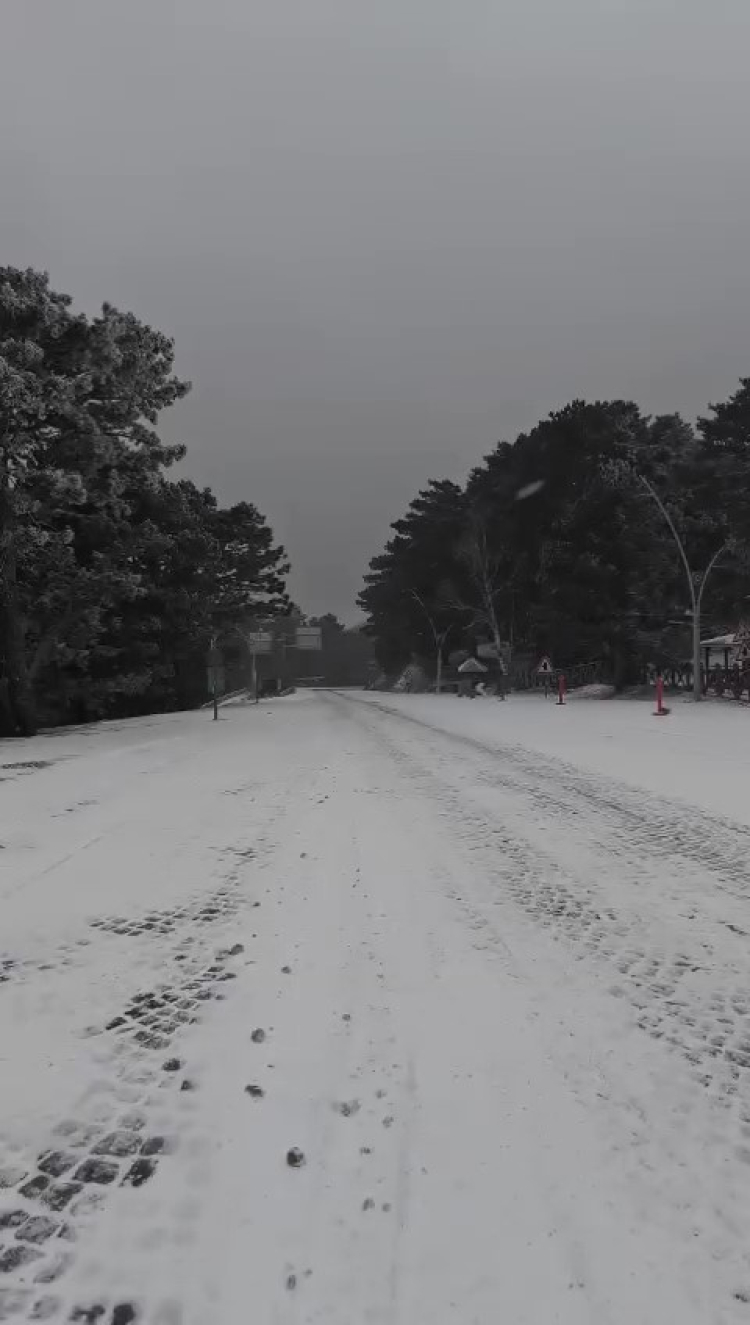 Uludağ'da etkili olan kar yağışıyla birlikte zirveye çıkan yollar karla kaplanmaya başladı.
