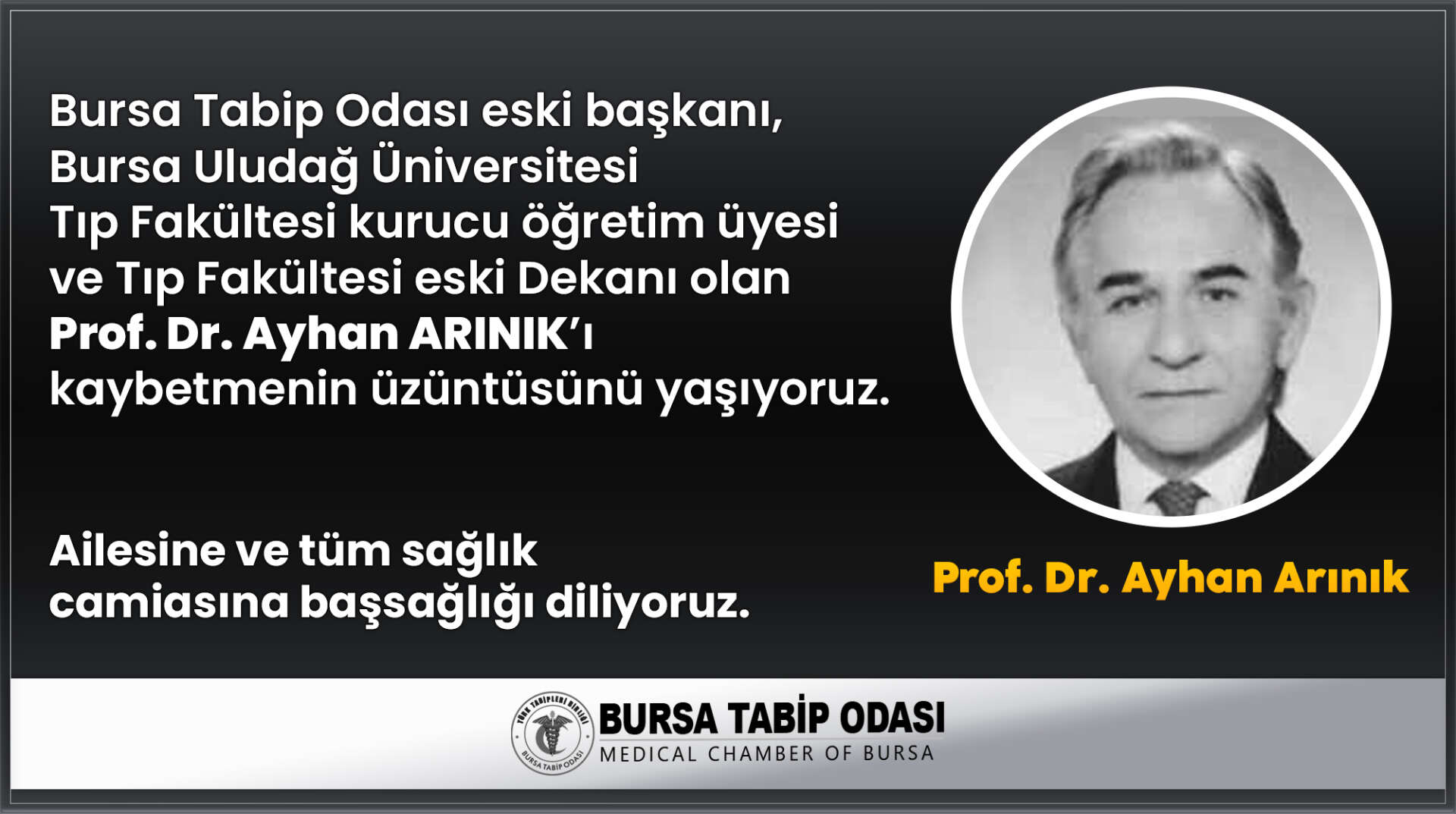 Bursa Tabip Odası eski Başkanı, Bursa Uludağ Üniversitesi Tıp Fakültesi Kurucu Öğretim üyesi ve Tıp Fakültesi eski Dekanı Prof. Dr. Ayhan Arınık, vefat etti.