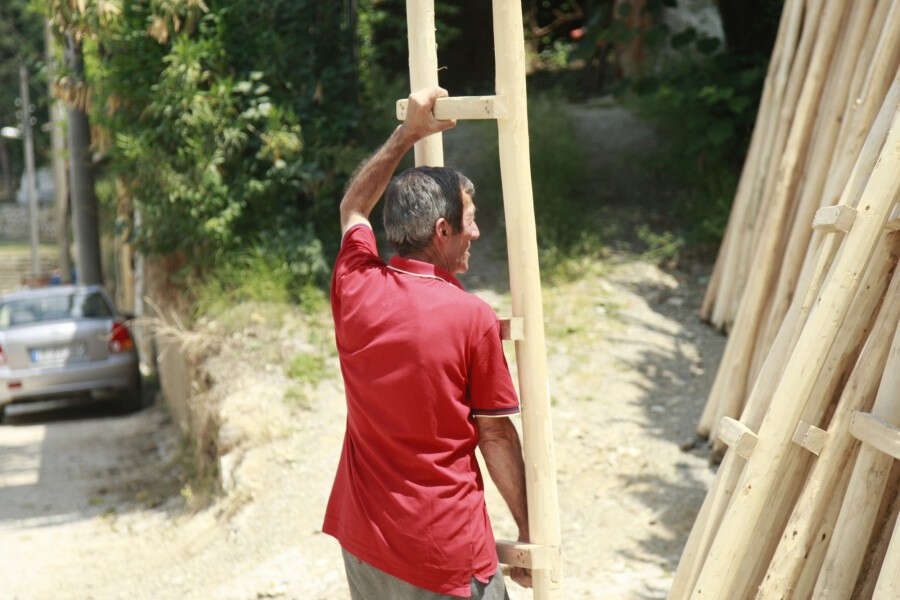 Eşi Zeynep Ilgın'ın da yardımını alarak merdiven üretimi yapan Ali Ilgın, 12 sene önce çalıştığı fabrikadan emekliye ayrıldıktan sonra merdiven imalatına hobi olarak başladığını belirterek, daha sonraları daha fazla merdiven üretmeye başladım. Merdiven deyip geçmeyin. İnsanlar bunun üzerine çıkıp ürününü topluyor, emeğinin karşılığını alıyor dedi. Merdiven direklerinin kavak ağacından yapıldığını belirten Ali Ilgın, kavak ağaçlarını mayıs ve haziran aylarında Konya'dan alıp buraya getiriyorum. Onları planzadan geçirdikten sonra boylarına göre ayırıp merdiven imalatında kullanıyorum dedi. Merdiven basamaklarını Karsak bölgesinden topladığı gürgen ağaçlarından yaptığını belirten Ali Ilgın, gürgen en sağlam ağaçlardandır. O yüzden gürgenden basamak yapıyorum. Basamakları kış boyunca Karsak bölgesinden temin ediyorum. Onları boylarına göre hazırlayıp bekletiyorum. 6 bin adet basamak hazırladım. Bunlardan 700 civarı merdiven imal etmiş olacağım dedi. Yaptığı işte çok titiz olduğunu belirttiğine dikkat çeken Ali Ilgın, merdivenler için çok emek harcıyorum. Özel hazırlıyorum. Uzun ömürlü olmaları için uğraş veriyorum diye konuştu.