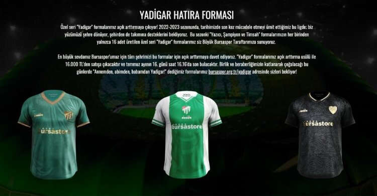 Bursaspor Kulübü’nden yapılan açıklama şu şekilde: “Özel seri ‘Yadigar’ formalarımız açık arttırmaya çıkıyor! 2022-2023 sezonunda, tarihimizde son kez mücadele etmeyi ümit ettiğimiz bu ligde; biz yüzümüzü şehre dönüyor, şehirden de takımına desteklerini bekliyoruz. Bu sezonki "Yazıcı, Şampiyon ve Timsah" formalarımızın her birinden yalnızca 16 adet üretilen özel seri "Yadigar" formalarımız siz Büyük Bursaspor Taraftarımıza sunuyoruz. En büyük sevdamız Bursaspor'umuz için tüm şehrimizi bu formalar için açık arttırmaya davet ediyoruz. "Yadigar" formalarımız açık arttırma usulü ile 16.000 TL'den satışa çıkacaktır ve temmuz ayının 16. günü saat 16.16'da son bulacaktır. Birlik ve beraberliğimizin katlanarak çoğalacağı bu günlerde "Annemden, abimden, babamdan Yadigar!" dediğimiz formalarımız bursaspor.org.tr/yadigar adresinde sizleri bekliyor!”