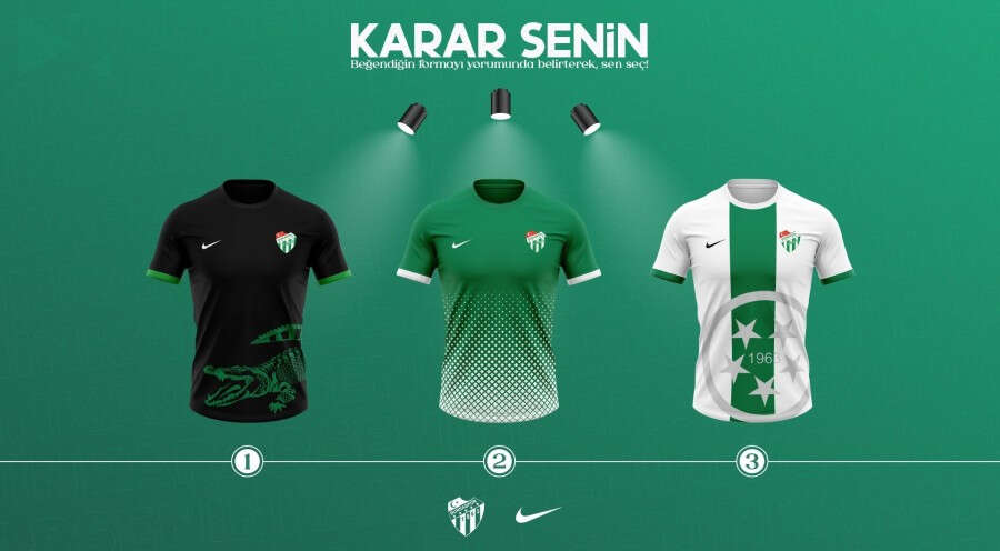 Bursaspor, forma sponsoru olan tedarikçi firmanın yeni formalarını camia ile paylaştı. Yeşil-beyazlı kulüp, firma tarafından gönderilen 6 forma seçeneğini 4'e indirmek için sosyal medya hesabından anket oluşturdu ve taraftarından yardım istedi.