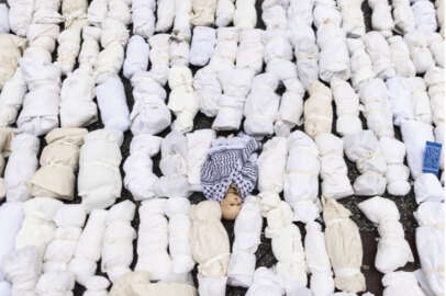 Gazze'de derhal ateşkes ilan edilmesi çağrısında bulunan göstericiler, kefene sarılı 500 bebek maketini caddeye bıraktı.