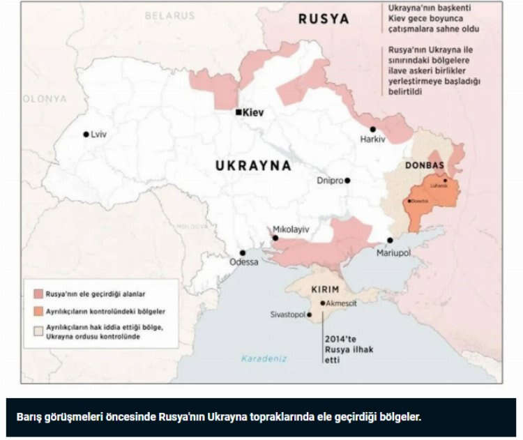 Savaşta bir hafta geride kalırken, taraflar ortak bir çözüm bulamıyor. Rusya, topraklarına kattığı kırım'ın yanısına, Ukrayna topraklarındaki ayrılıkçı bölgelerin tanınmasını, Ukrayna yönetiminin NATO üyeliği gibi uluslararası ittifaklara katılmaması istiyor. Bu dayatmalara karşı çıkan Ukrayna yönetimi ise öncelikle işgalin sone erdirilmesini talep ediyor.