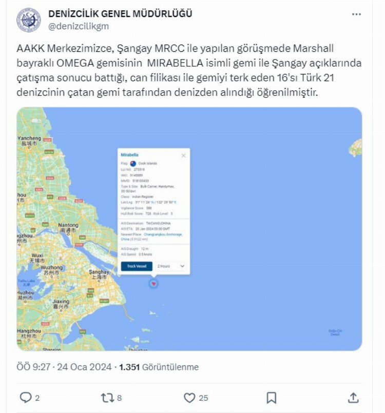 "AAKK Merkezimizce, Şangay MRCC ile yapılan görüşmede Marshall bayraklı OMEGA gemisinin MIRABELLA isimli gemi ile Şangay açıklarında çatışma sonucu battığı, can filikası ile gemiyi terk eden 16'sı Türk 21 denizcinin çatan gemi tarafından denizden alındığı öğrenilmiştir.