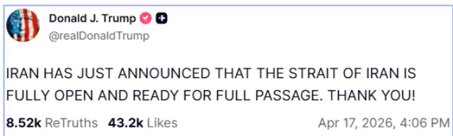 "İRAN YAKIN ZAMANDA İRAN BOĞAZI'NIN TAMAMEN AÇIK OLDUĞUNU VE TAM GEÇİŞE HAZIR OLDUĞUNU AÇIKLADI. TEŞEKKÜRLER! - Başkan Donald J. Trump"