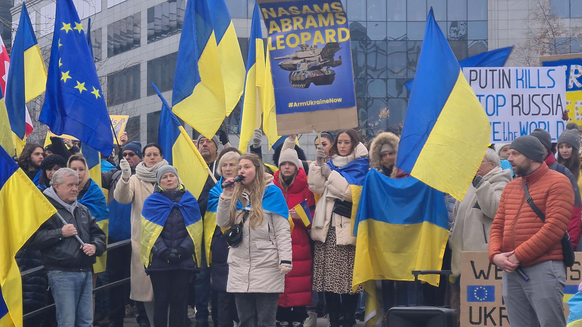 Almanya'nın isteksiz olduğu tank desteği konusunu vurgulamak için Abram ve Leopard tanklarının resimlerini taşıyan ve "Avrupa şimdi harekete geç" sloganları atan Ukraynalı göstericiler, ülkelerinin ihtiyacı olan silahların ve özellikle tankların bir an evvel kendilerine verilmesini istediklerini, bunlarla hem insanlarını hem de topraklarını geri almak istediklerini savundu. Ayrıca AB'den Rusya'ya karşı yeni yaptırım kararları almasını da isteyen ve AB ile Rusya arasında hiçbir ekonomik ilişki kalmamasını talep eden göstericiler "Rusya pırlantasına hayır" sloganları da attı.