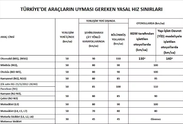 Yasaya göre otomobiller için hız sınırları şehirler arası çift yönlü karayollarında 90 kilometre, bölünmüş yollarda 110 kilometre, devlet işletmesindeki otoyollarda 130 kilometre ve yap-işlet-devret otoyollarında 140 kilometre olarak uygulanıyor.