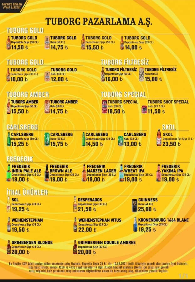 Tuborg Gold 50 CL Şişe (depozitolu) 14,50 TL olurken, Carslberg 50 CL Şişe 15,25 TL olarak fiyatlandırıldı. 35 CL Frederik Craft serisinin ise satış fiyatı 19 TL oldu.