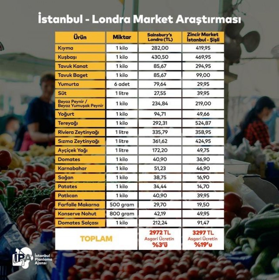 İstanbul Planlama Ajansı (İPA) Başkanı Buğra Gökce, sosyal medya hesabından X üzerinden yaptığı paylaşımda, mutfaklarda bulunan 20 temel ürünü esas alarak İngiltere'nin en büyük zincir marketi Sainsbury's ile İstanbul'da bir zincir marketteki fiyatların karşılaştırıldığı bir araştırma paylaştı.