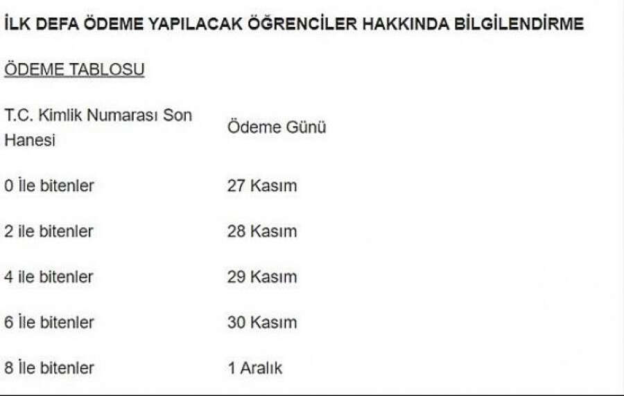 Kredi ve Yurtlar Kurumu'ndan bursların yatacağı tarih ile ilgili açıklama geldi. İlk defa burs/öğrenim kredisi müracaatında bulunup işlemleri tamamlanan öğrencilerin ilk ödemelerine (ekim ve kasım ayları birlikte olmak üzere) 27 Kasım 2019 tarihi itibarıyla T.C. kimlik numarasının son hanesine göre başlanacaktır.