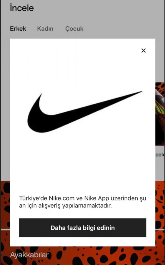Popüler spor ayakkabı markası Nike, bugün web sitesinde "Türkiye'de Nike.com ve Nike App üzerinden şu an için alışveriş yapılamamaktadır." başlığıya bir bilgilendirme yayınladı. Şirket, an itibariyle müşterilerin sipariş veremeyeceğini duyurdu.