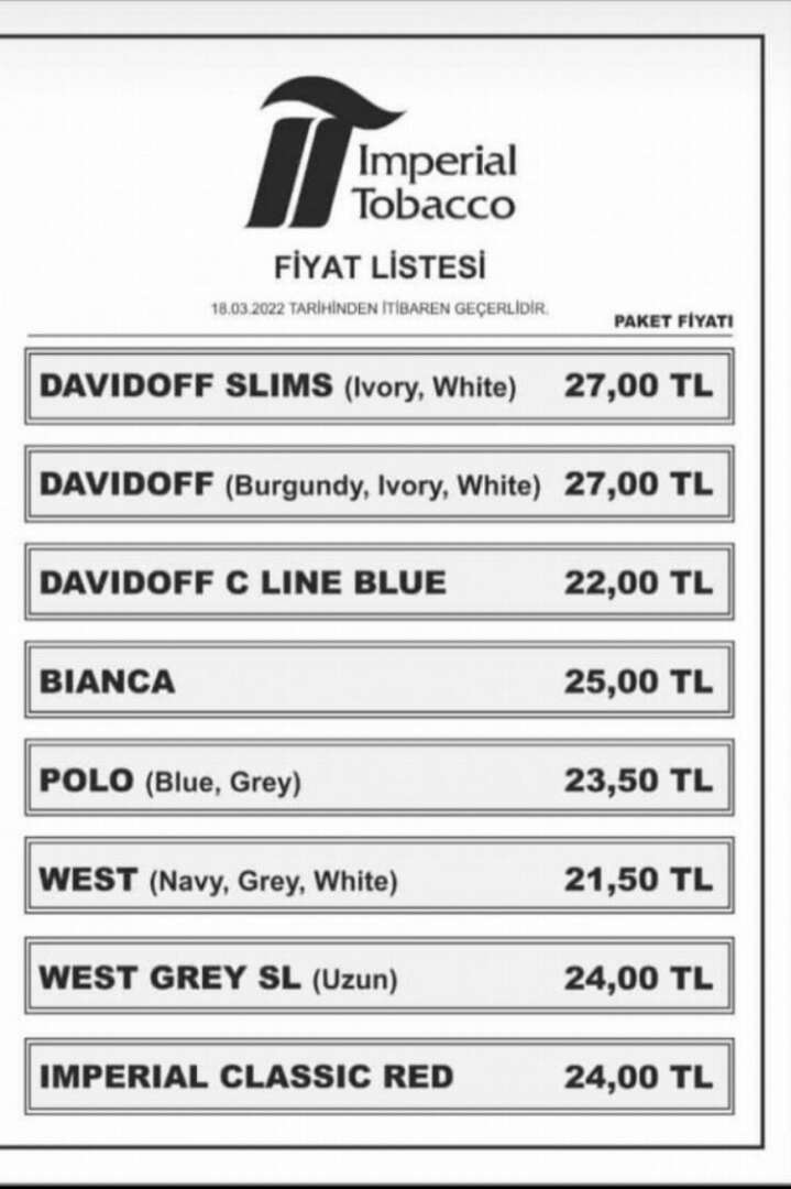 Tekel Bayileri Platformu Özgür Aybaş'ın Twitter hesabından paylaştığı yeni listeye göre Davidoff 27 liraya yükselirken Bianca 25 lira, Polo 23,5 lira ve kısa West 21,5 lira oldu.