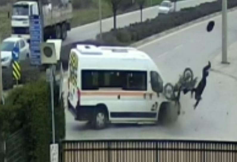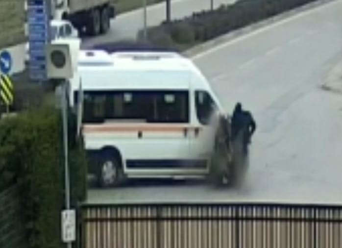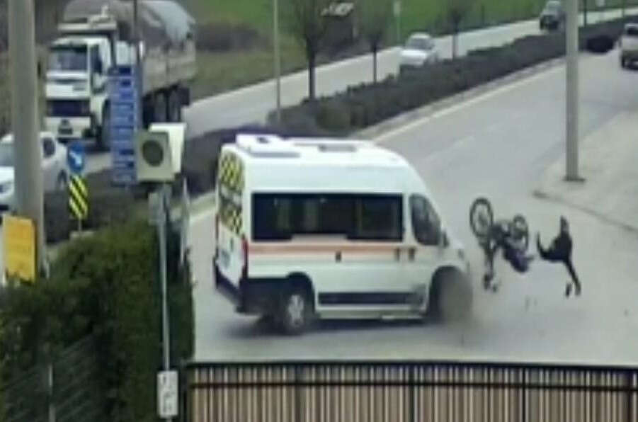 Bursa'nın İnegöl ilçesinde meydana gelen kazada servis minibüsü ile çarpışan motosikletin sürücüsü yaralandı. Kaza anı bir iş yeri güvenlik kameralarına saniye saniye yansıdı.