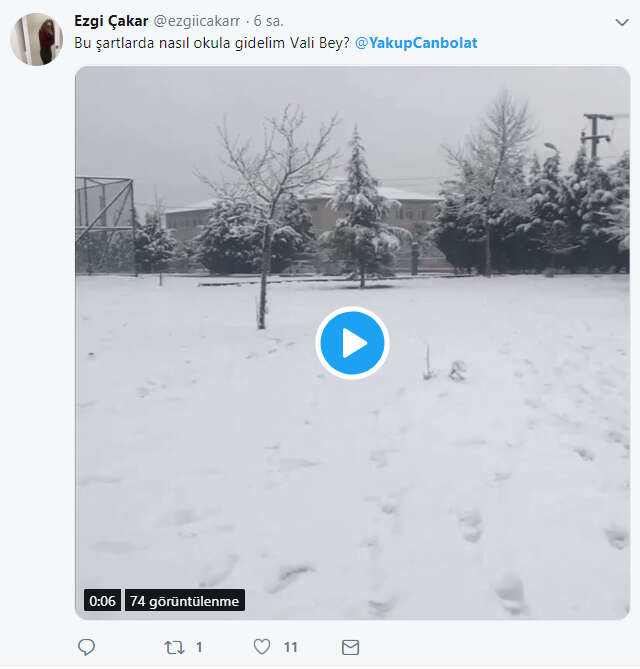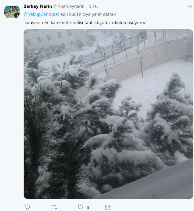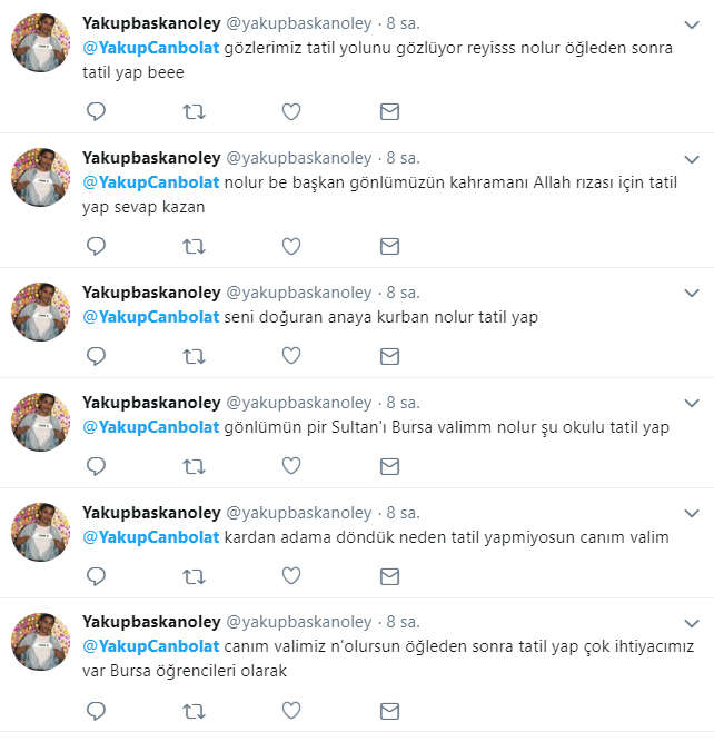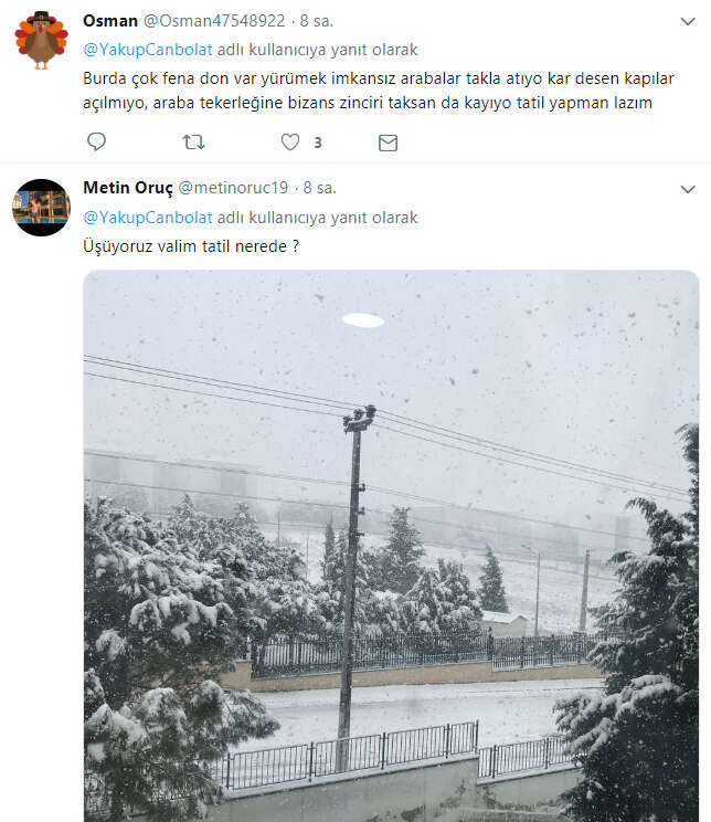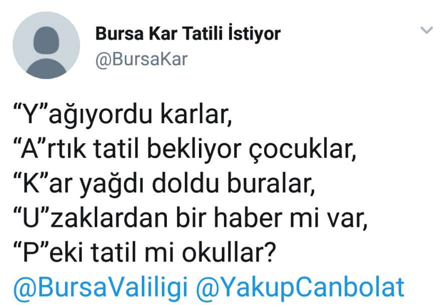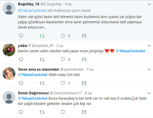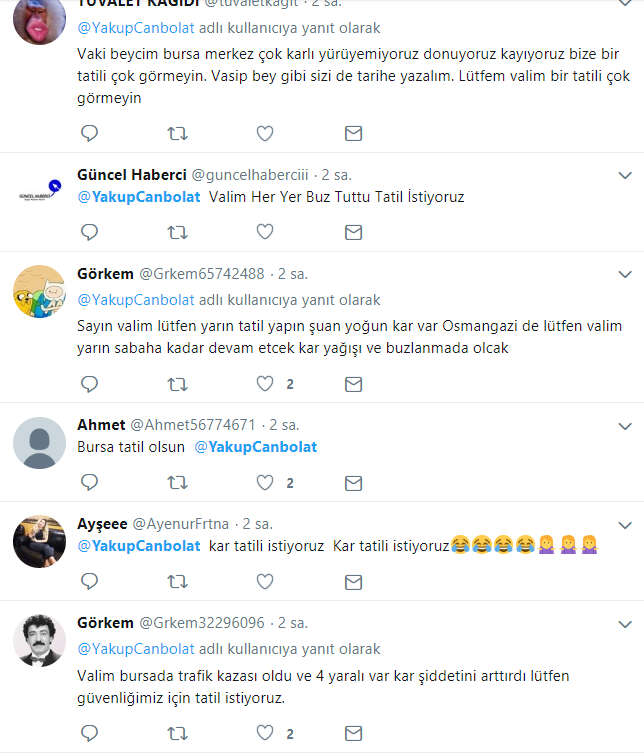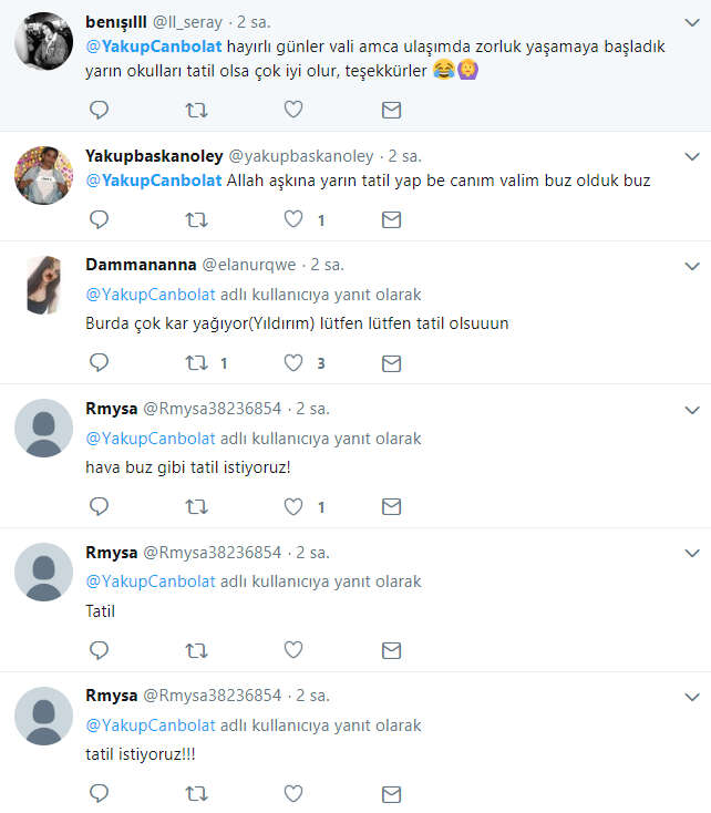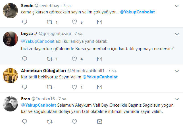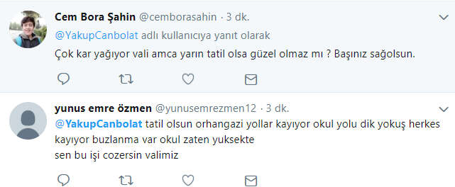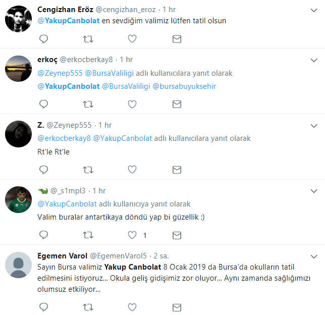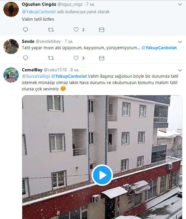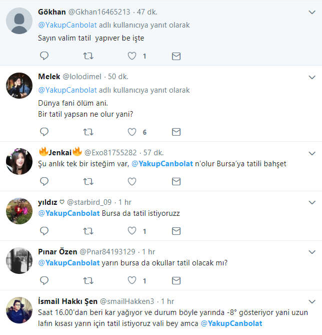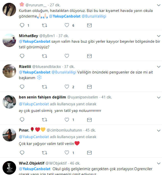 Meteoroloji'den yapılan açıklamaların ardından karayolları ve belediyeler teyakkuza geçti. Bursa'da da kar yağışı nedeniyle tatil isteyen öğrenciler, Vali Yakup Canbolat'ı tweet yağmuruna tuttu. Sosyal medya hesaplarından birçok paylaşım yapan öğrenciler, Vali Canbolat'a methiyeler düzerek, okulların 8 Ocak Salı günü de tatil olmasını istedi. İşte öğrencilerin gülümseten o paylaşımları...