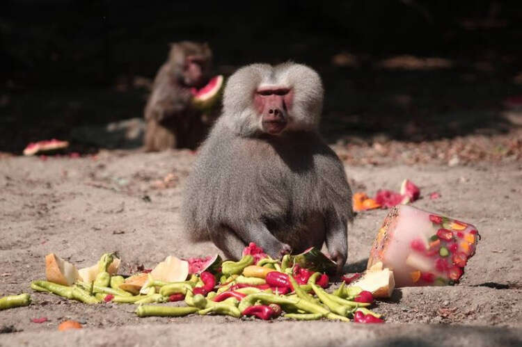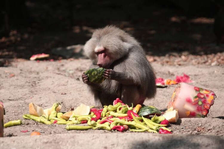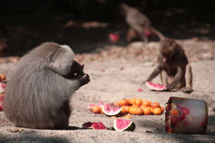Bursa Büyükşehir Belediyesi Hayvanat Bahçesi’nde hayvanlar Afrika sıcaklarında buzlu meyve ve sebzelerle serinliyor.
